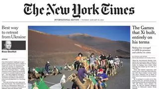 El New York Times ha dedicado la foto de su portada internacional a Lanzarote. Los turistas sobre los dromedarios del Parque Nacional de Timanfaya copan la foto principal del texto que repasa el modelo turístico en tiempos de Covid. La pieza del NYTimes, firmada por Nicholas Casey y José Bautista, repasa las diferentes normas que han aplicado los países europeos ante la expansión de ómicron y la sexta ola.