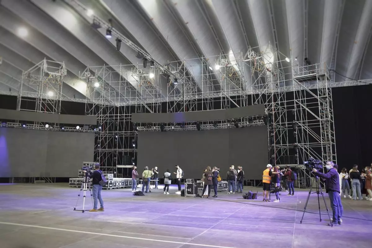 Más de 100 personas pertenecientes a 12 empresas canarias llevan trabajando en el montaje del plató desde el 8 de febrero, que dispondrá de un espacio escénico diáfano de 40x35 metros y albergará una pantalla de vídeo en led.