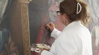 La restauradora Candelaria García durante los trabajos de recuperación del cuadro datado en torno a 1680 y rescatado de Las Palmas de Anaga. / GOBIERNO DE CANARIAS