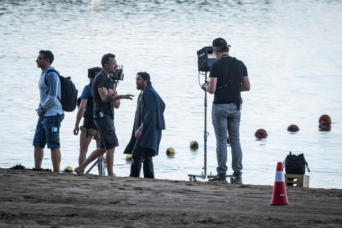 El actor Gerard Butler graba escenas de la película 'Juego de ladrones 2' en la playa de Las Teresitas, en Santa Cruz de Tenerife