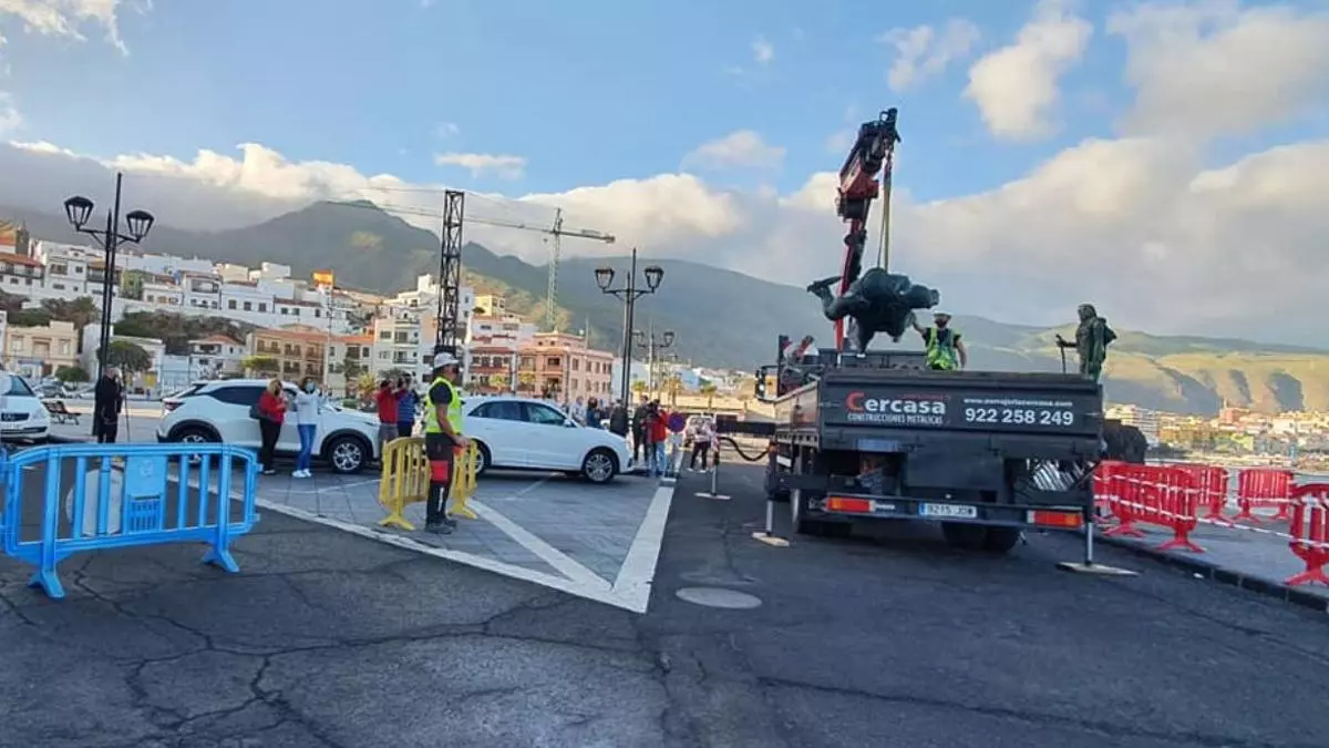 Retirada de dos de los menceyes de la plaza de la Patrona de Canarias, en Candelaria. / El Día